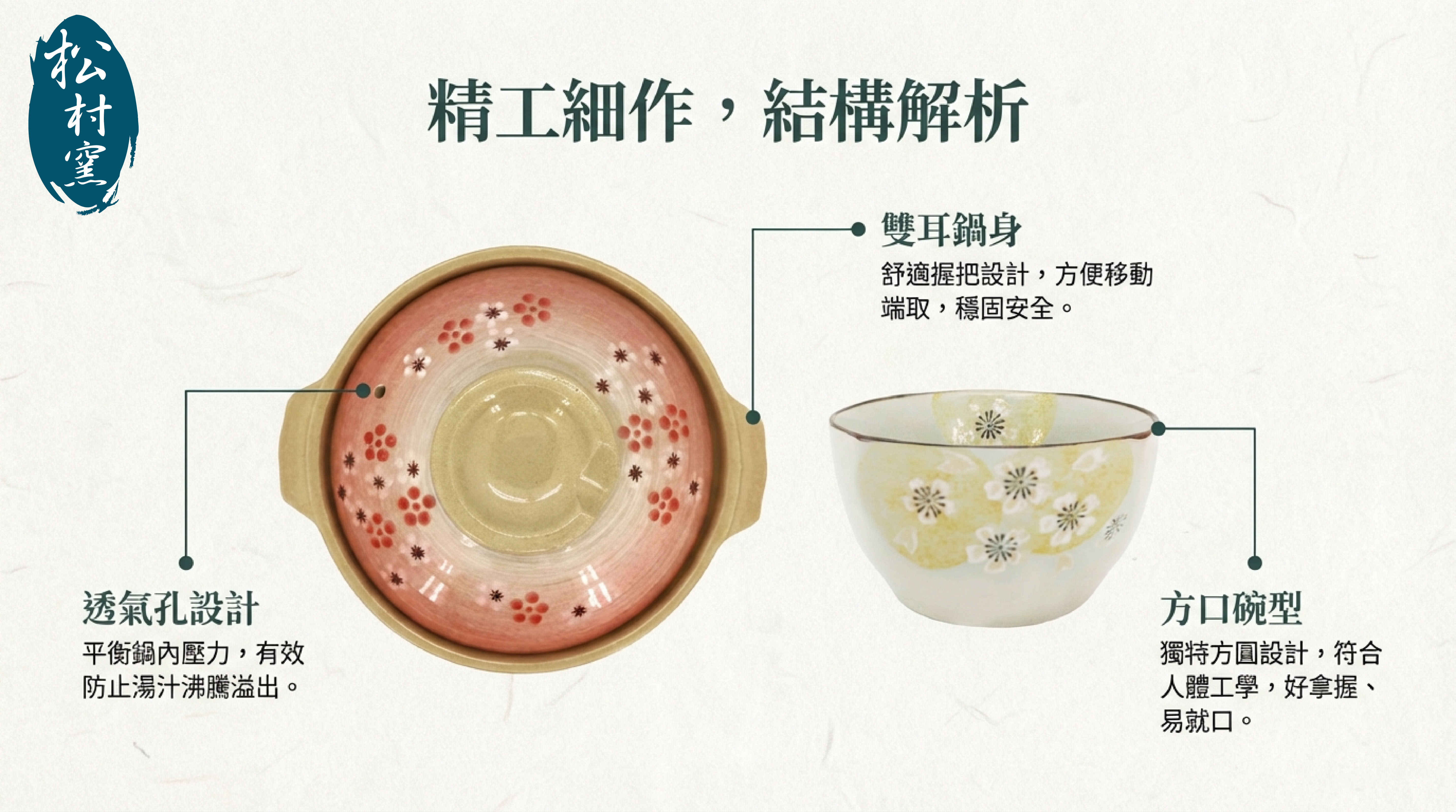 砂鍋蓋上有蒸氣孔,煮食不會溢出, 簡約大方的風