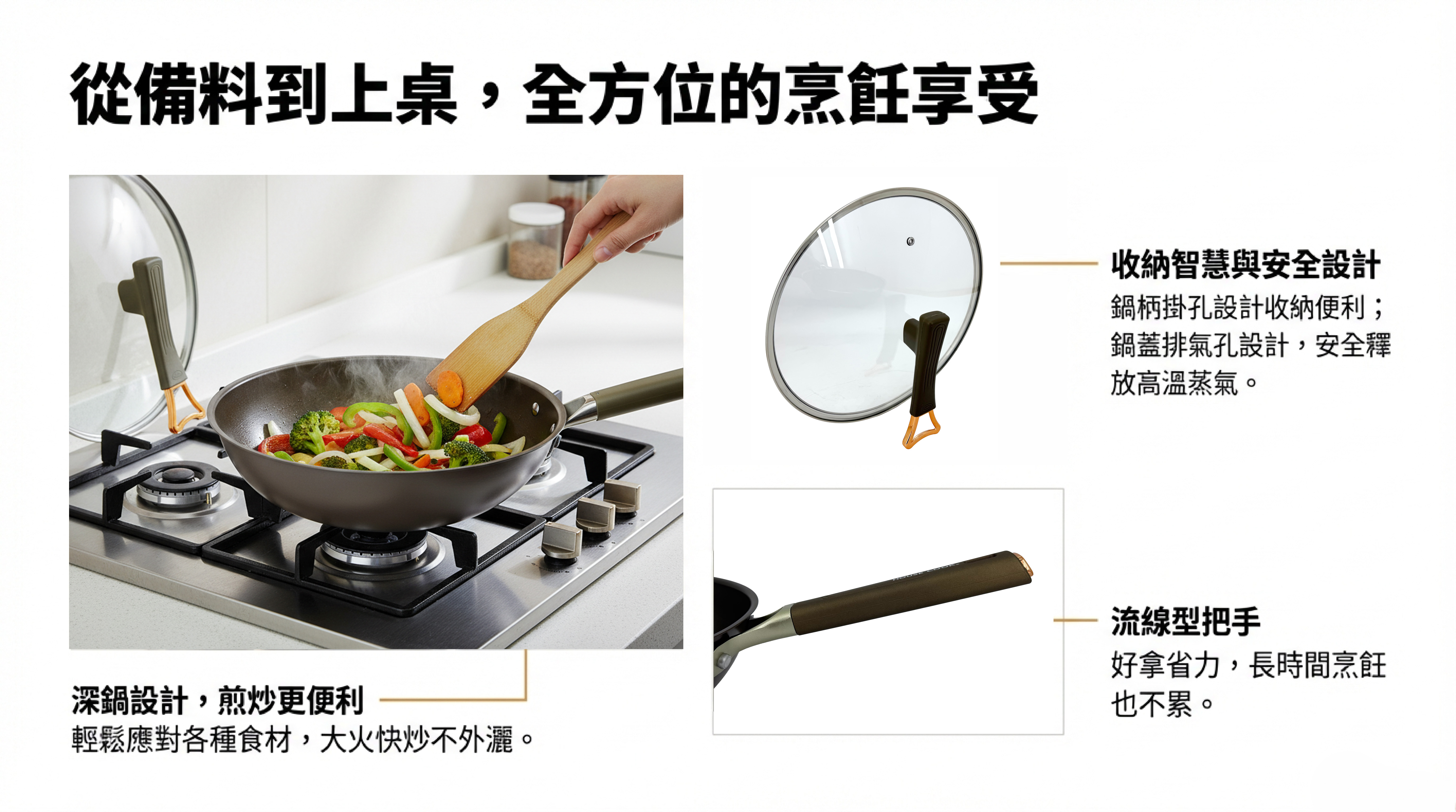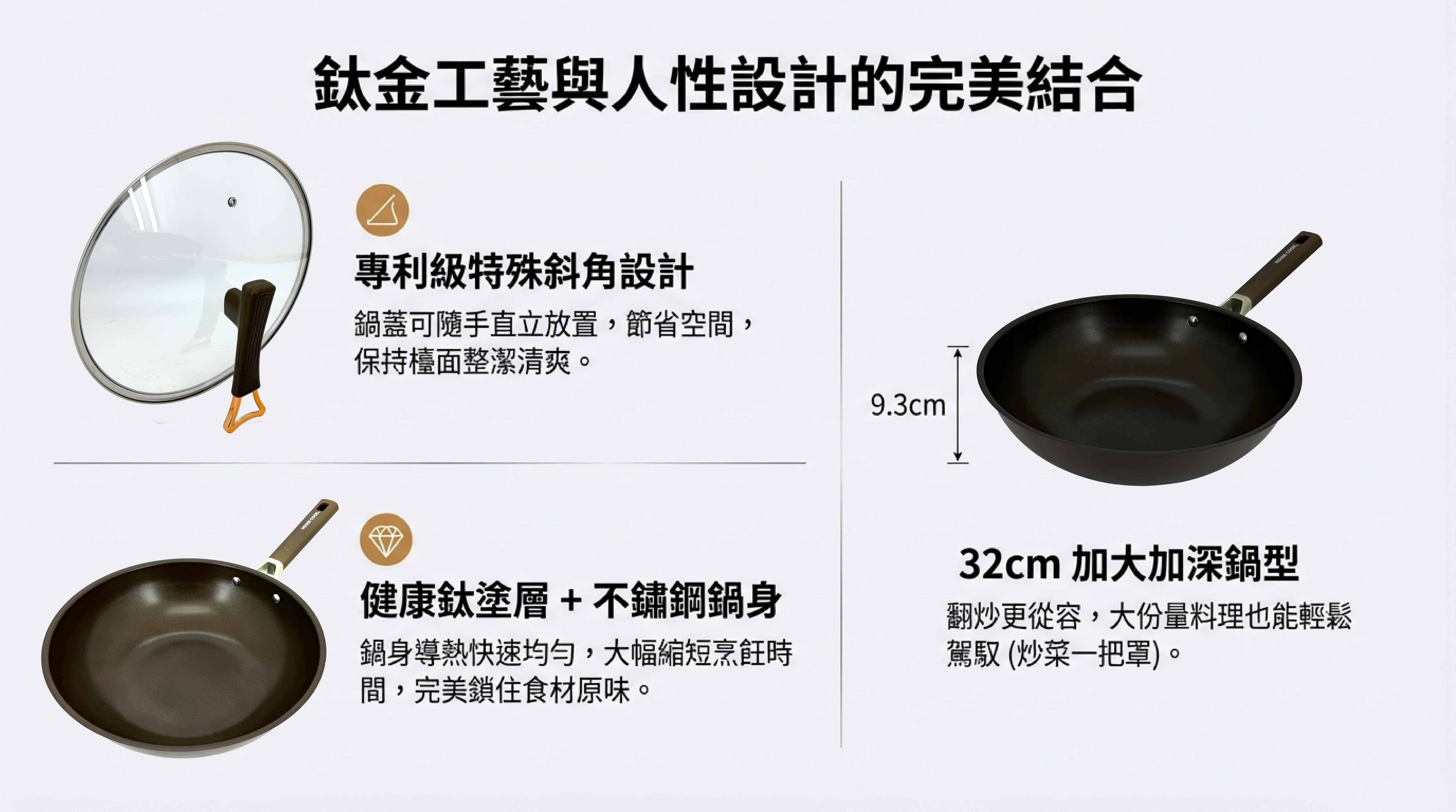 Ø鍋柄掛孔設計 收納好便利。特殊斜角